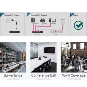 – Package Contents: TL-SG108PE, Power Adapter, Installation Guide, Rubber Feet