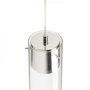 Viseća svjetiljka s difuzorom od satiniranog stakla. Poklopac na dnu je osiguran s okruglom krom pločom.
