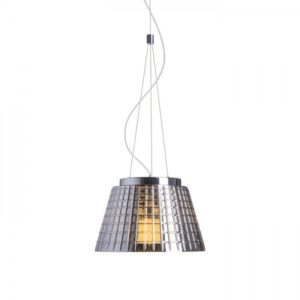 Viseća svjetiljka za dvije okrugle fluorescentne cijevi T5. Donji poklopac od satiniranog stakla je pričvršćen vijkom koji je pokriven s krom pločom. Bočni paneli su od mat akrila.